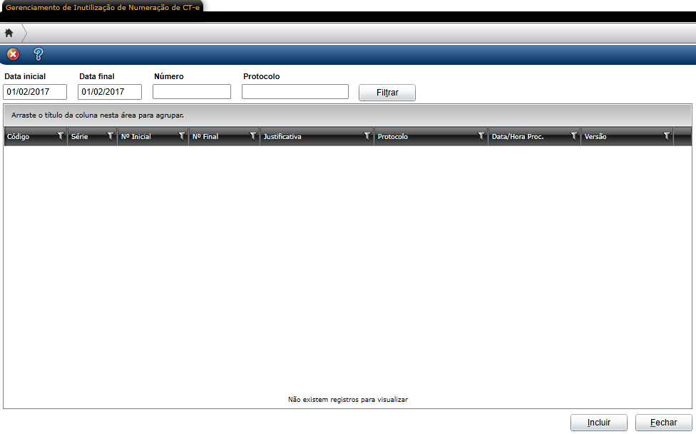 O botão [Incluir] direciona à tela [Inutilização de Numeração de CT-e] para inclusão de uma faixa de CT-e’s a serem inutilizados.