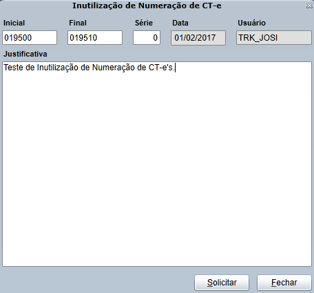 Nesta tela, além da faixa de número de CT-e’s, é obrigatório descrever uma justificativa para a inutilização dos CT-e’s.