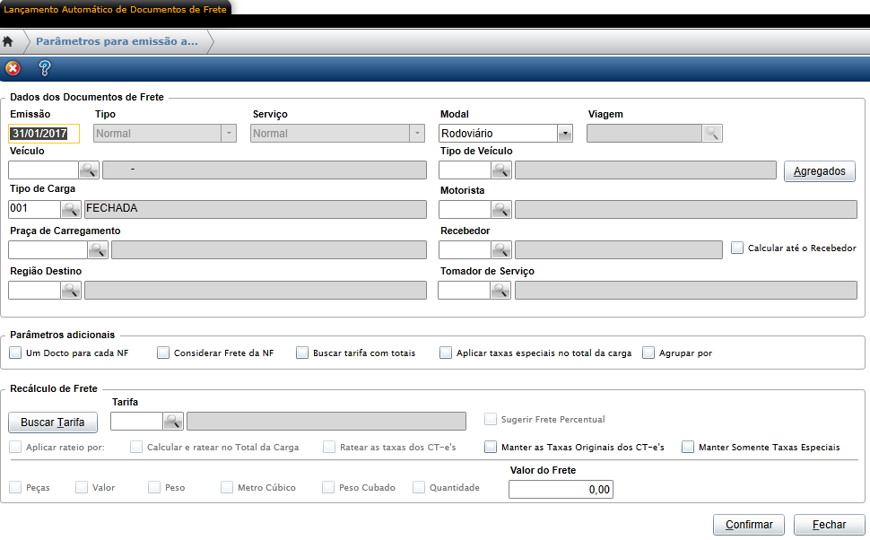 - Buscar tarifa: permite selecionar uma tabela de tarifa que atenda as condições do frete;
