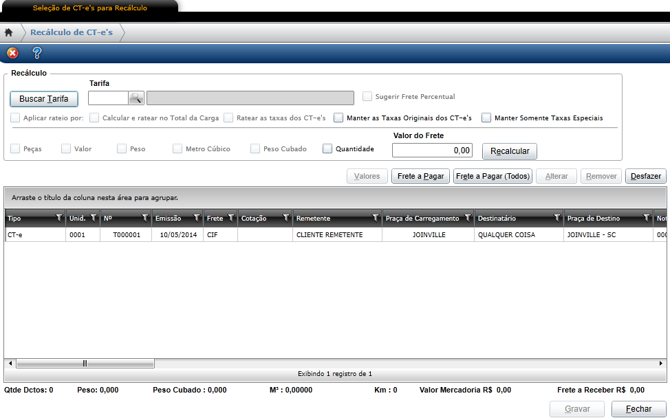 Depois, acionar o botão [Recalcular] que direcionará para a tela [Recálculo de CT-es]: