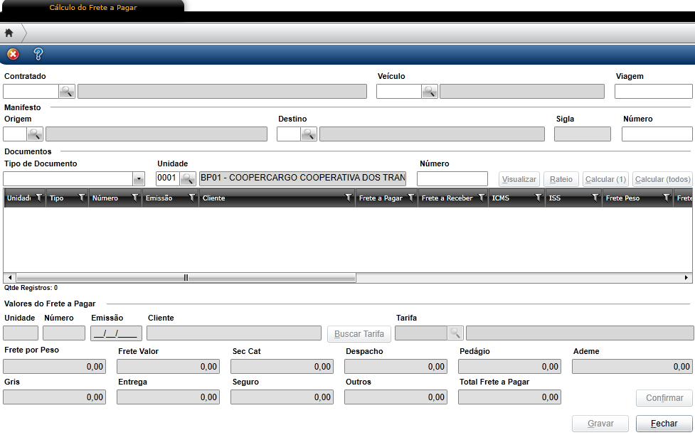 - Frete a Pagar: permite efetuar o cálculo do frete a pagar do CT-e.