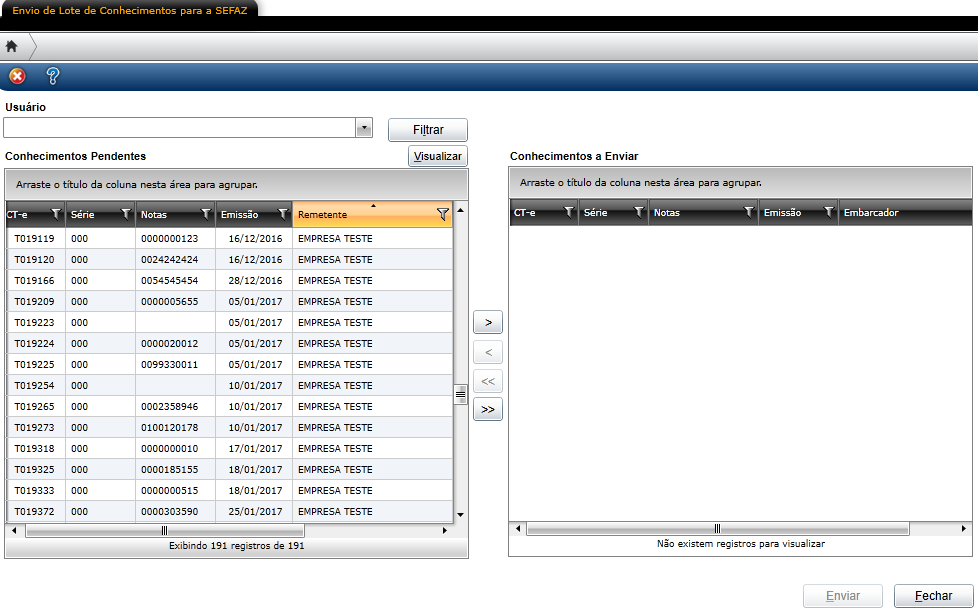 A tela [Envio de Lote de Conhecimentos para SEFAZ] permite enviar um lote de CT-e’s para validação no SEFAZ. Em Operacional > Expedição > Conhecimento de Frete > Envio do Lote para CT-e. Onde, para realizar o envio de CT-es em lote, basta selecionar os CT-e’s na grid [Conhecimentos Pendentes], movê-las para a grid [Conhecimentos a Enviar] e acionar o botão [Enviar]. Lembrando que só permitido o envio para validação de 50 CT-e’s por vez. Estando de acordo com os parâmetros do SEFAZ, o sistema vai retornar a mensagem de autorização do documento.