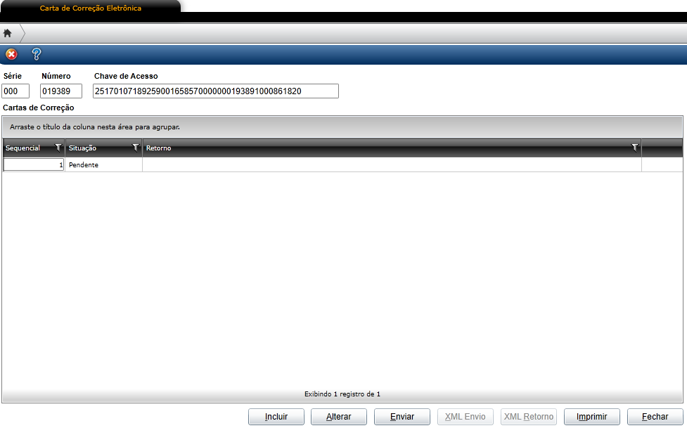 Após gravar a carta de correção eletrônica, por meio dos botões dispostos na tela [Carta de Correção Eletrônica], é possível alterar, enviar ao SEFAZ, visualizar os XML’s de envio e de retorno e imprimir a CC-e. Depois de enviada ao SEFAZ, a situação da CC-e muda para “Aprovado”, não sendo mais possível alterá-la.