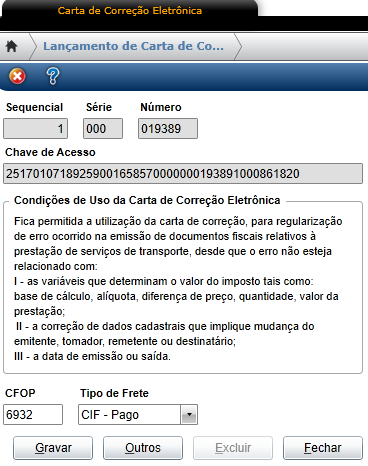 A carta de correção eletrônica é uma forma alternativa de correção de um CT-e, para evitar a necessidade de emitir um novo CT-e para correção de dados. Em Operacional > Expedição > Conhecimento de Frete > Carta de Correção Eletrônica
