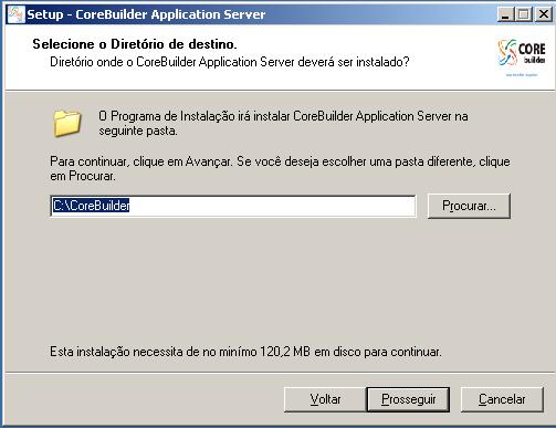 2. Será exibida em seguida a tela “Selecione o Diretório de destino!”. Por default será o “C:\CoreBuilder”, mas poderá ser substituído por outro qualquer.