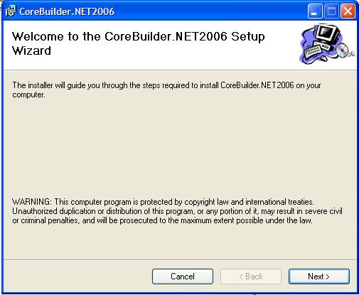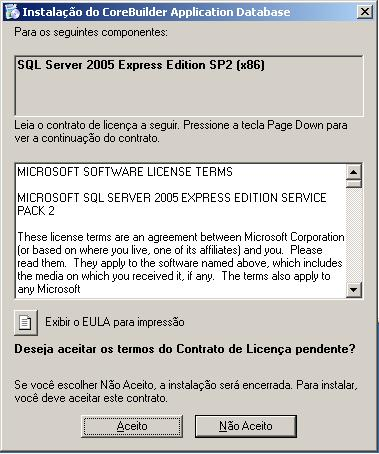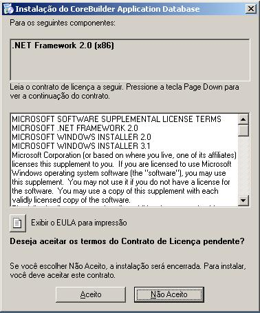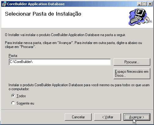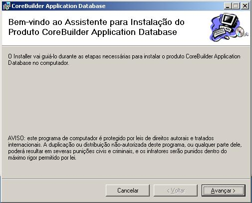 O instalador do CoreBuilder Application Database é o arquivo SETUP.EXE. Este instalador irá instalar os programas necessários e em seguida invocar o arquivo ‘CoreBuilder Application Database.msi’. A instalação direta a partir deste arquivo provocará um erro na instalação. Assim, sempre efetue a instalação pelo arquivo SETUP.EXE.