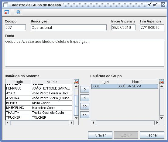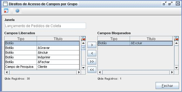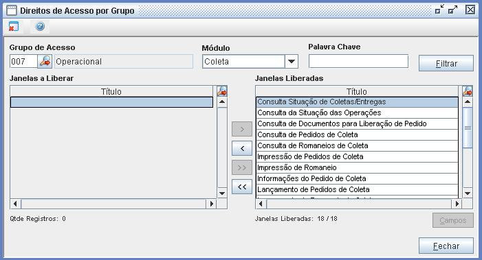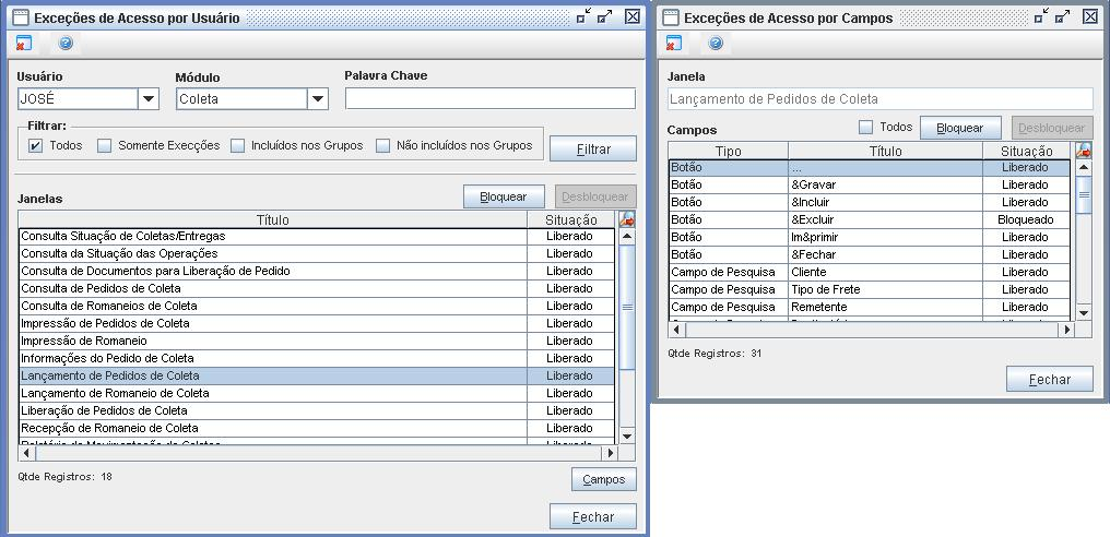 Acessando Configuração > Controle de Acesso > Exceções de Acesso por Usuário, é possível liberar ou bloquear o acesso a uma janela ou o controle de uma janela para um usuário específico, mesmo que este já participe das definições de algum grupo.