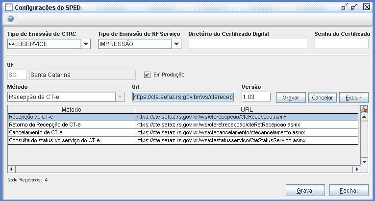 9. Configurar, também na opção acima citada em todas as unidades, as Url's de webservice dos métodos do CT-e para o(s) Estado(s) em questão. Conforme o exemplo abaixo para o Estado SC: