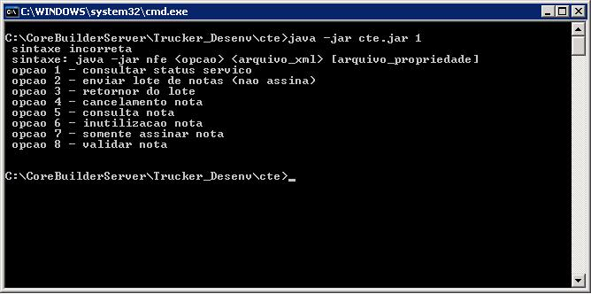 1. Para executar a biblioteca java, acesse o prompt de comando (CMD) e execute o comando “java -jar cte.jar” a partir da pasta ‘cte’ no servidor Trucker.