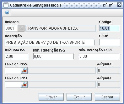 4. Em Cadastro > Fiscal > Serviços Municipais, cadastrar o serviço fiscal com o seu respectivo código e alíquota na Prefeitura, por Unidade emissora, conforme exemplo abaixo: