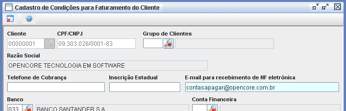 5. Em Cadastro > Comercial > Clientes, opção ‘Faturamento’, efetuar o cadastro do e-mail do cliente para recebimento da NF eletrônica, que será enviado diretamente pela Prefeitura.