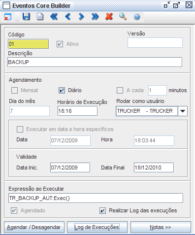 5. A ‘expressão ao executar’ do backup deve ser a apresentada acima: ‘TR_BACKUP_AUT:Exec()’. A opção ‘Agendado’ deve ficar ativada através do botão ‘Agendar / Desagendar’. A opção ‘Realizar Log das execuções’ é importante manter ligada para observarmos a estabilidade do agendamento. Estes mesmos logs podem ser observados no botão ‘Log de execuções’.
