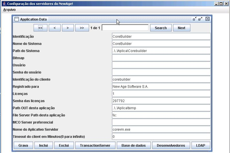 Por default, sempre que efetuamos uma nova instalação do CoreBuilder, uma licença de uso é fornecida, para um único usuário, já definido como: usuário: core, senha: builder. Os demais dados da licença constam nesta tela. Para configurar estes dados para o novo cliente, é necessário solicitar junto a NewAge a licença para este cliente, o que será feito através do envio de um arquivo chamado ‘APP.SER’. Este arquivo deve ser substituído na pasta (por default): ‘C:\CoreBuilder\ApplicationServer\Server\app.ser’.