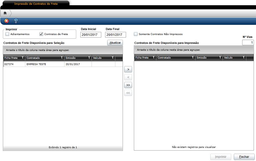 Em Impressão corre a seleção dos contratos de frete ou adiantamentos que devem ser impressos e enviados por e-mail para o contratado. É preciso preencher os filtros presentes na tela e clicar no botão Atualizar para que os registros sejam apresentados na grid Contratos de Frete Disponíveis para Seleção. Em seguida, os registros devem ser repassados para a grid Contratos de Frete Disponíveis para impressão para que estejam disponíveis para impressão.