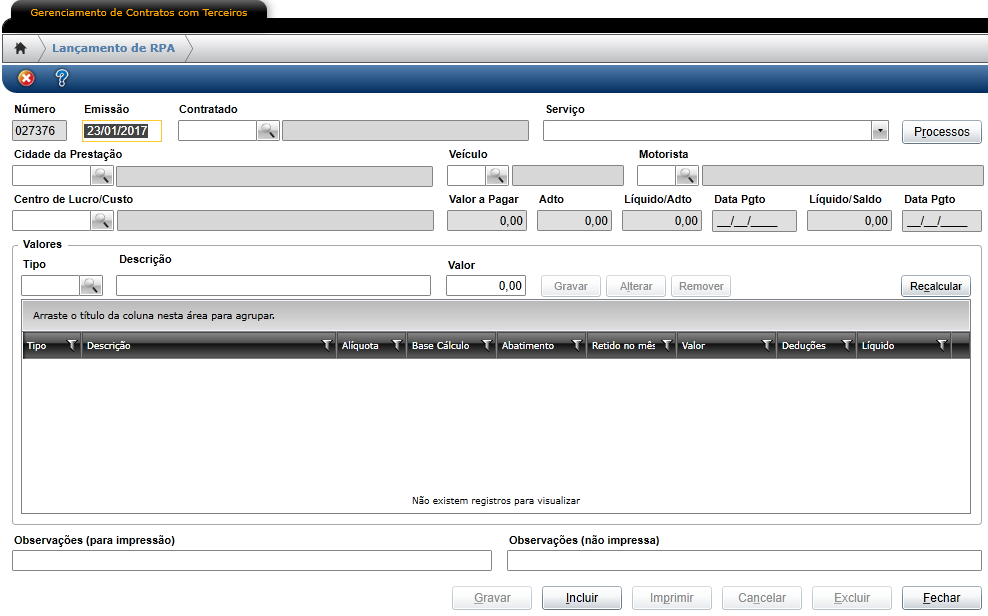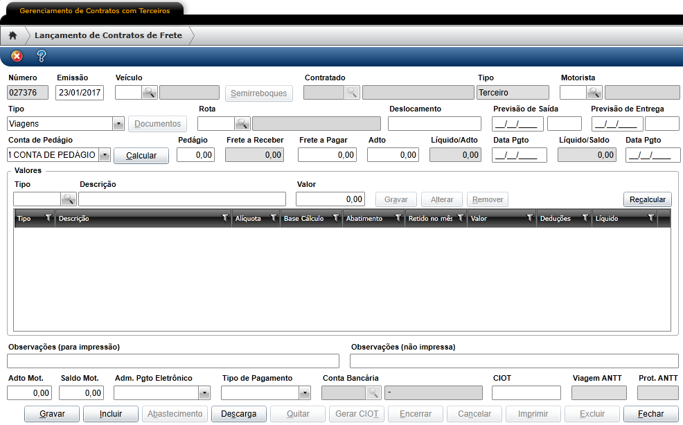 | Valores | Nessa grid devem ser informadas todas as despesas que o terceiro terá para realização da viagem. Quando necessário, deve-se gerar ordem de abastecimento para pagar o combustível ao terceiro |