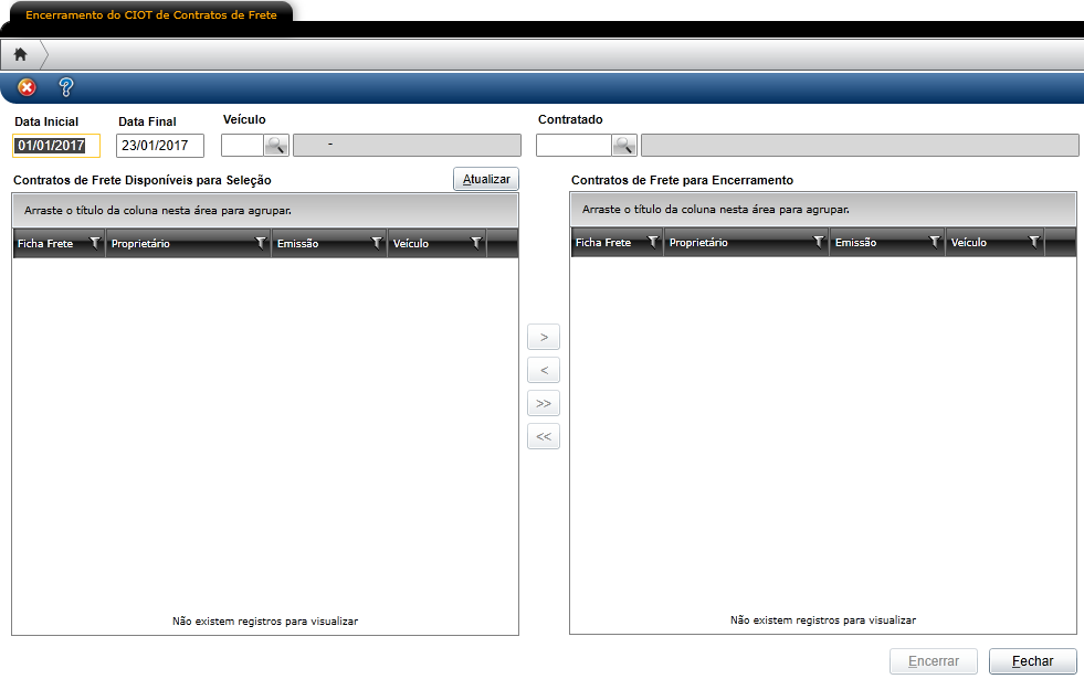 É preciso preencher os filtros presentes na tela e clicar no botão Atualizar, para que os registros sejam apresentados na grid Contratos de Frete Disponíveis para Seleção. Em seguida, os registros devem ser repassados para a grid Contratos de Frete para Encerramento.