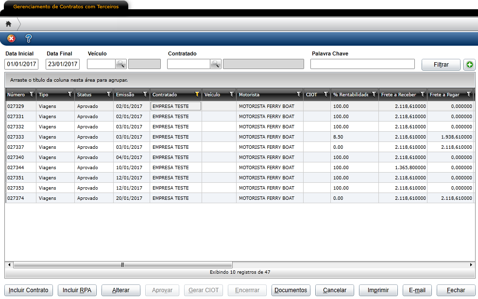 Em encerramento é realizadoa seleção dos contratos de frete ou adiantamentos que devem ser encerrados, ou seja, os contratos onde já foi emitido RPA e realizado o pagamento ao contratado.