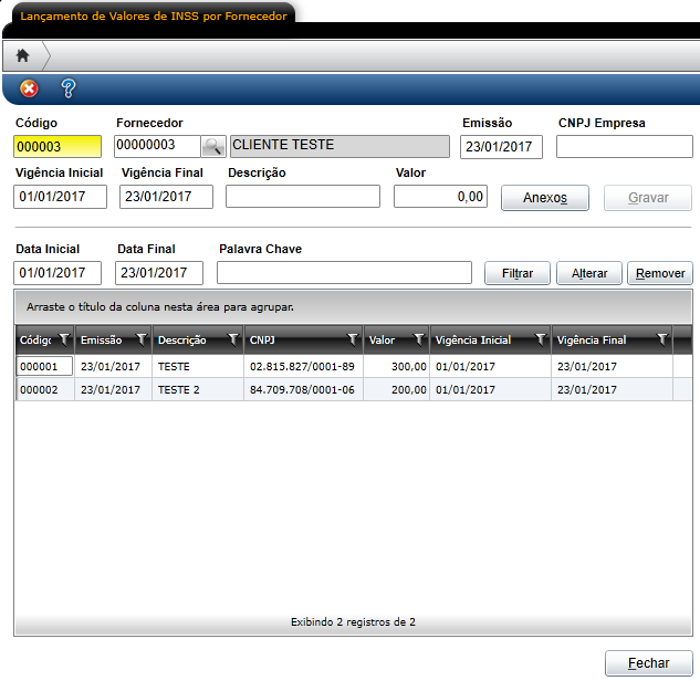 Para realizar o lançamento, basta preencher os campos, especificando o fornecedor (terceiro), o CNPJ da empresa em que ele prestou serviço e reteve o INSS, o período de vigência e o valor pago de INSS. Depois, utilizar o botão Gravar.