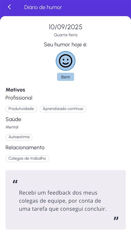 - Nas datas que tiverem um registro de humor, toque no card para abrir os detalhes. Os detalhes mostram os motivos e notas que você incluiu aquele dia.