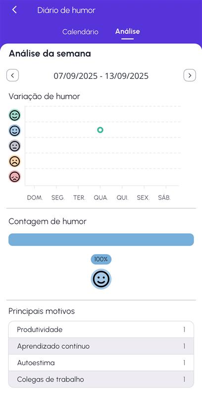 - Análise: o relatório de análise mostra as informações de humor consolidadas por semana, mostrando a variação de humor e os motivos que mais apareceram no período. Essa é uma excelente forma de identificar padrões no seu humor e conhecer o que leva você a se sentir bem ou mal.