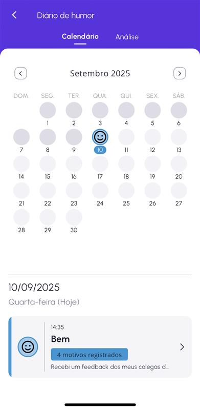 O calendário é a forma mais prática de você buscar as informações dos dias que tiveram registros de humor.