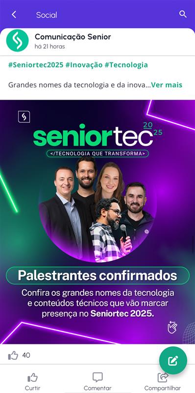 Com o Wiipo você tem uma experiência integrada com o Social — a solução de rede social corporativa da Senior. Com essa integração, você pode usar o Wiipo para acessar as publicações que foram feitas no Social pela XPlatform ou pelo próprio app.