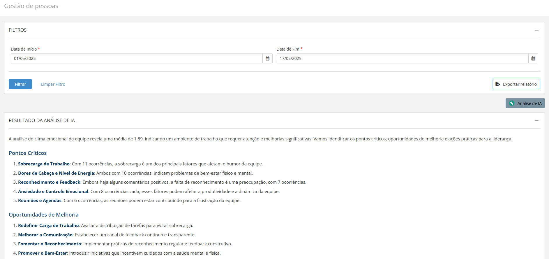 - Pontos Críticos: A IA identifica e lista os principais fatores que impactam negativamente o clima, baseando-se na frequência de ocorrência dos motivos (tags) e comentários associados aos registros de humor. Cada ponto crítico é acompanhado de uma breve explicação sobre seu impacto e número de ocorrências, facilitando a priorização de ações corretivas.