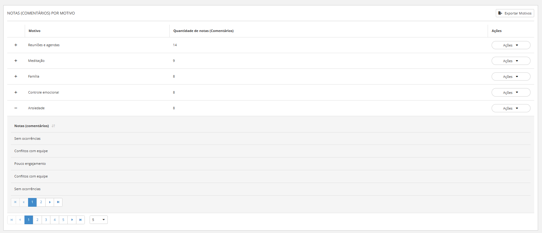 - Quantidade de notas (comentários): Mostra quantas vezes cada motivo foi acompanhado de um comentário adicional pelo colaborador. Isso indica a frequência com que determinado motivo gerou observações qualitativas.