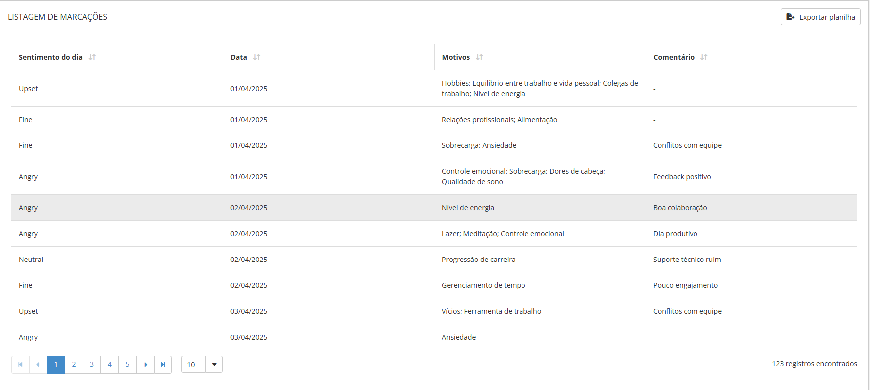 - Motivos: Lista os motivos (tags) selecionados pelo colaborador para justificar ou explicar o sentimento registrado. Os motivos aparecem separados por ponto e vírgula.
