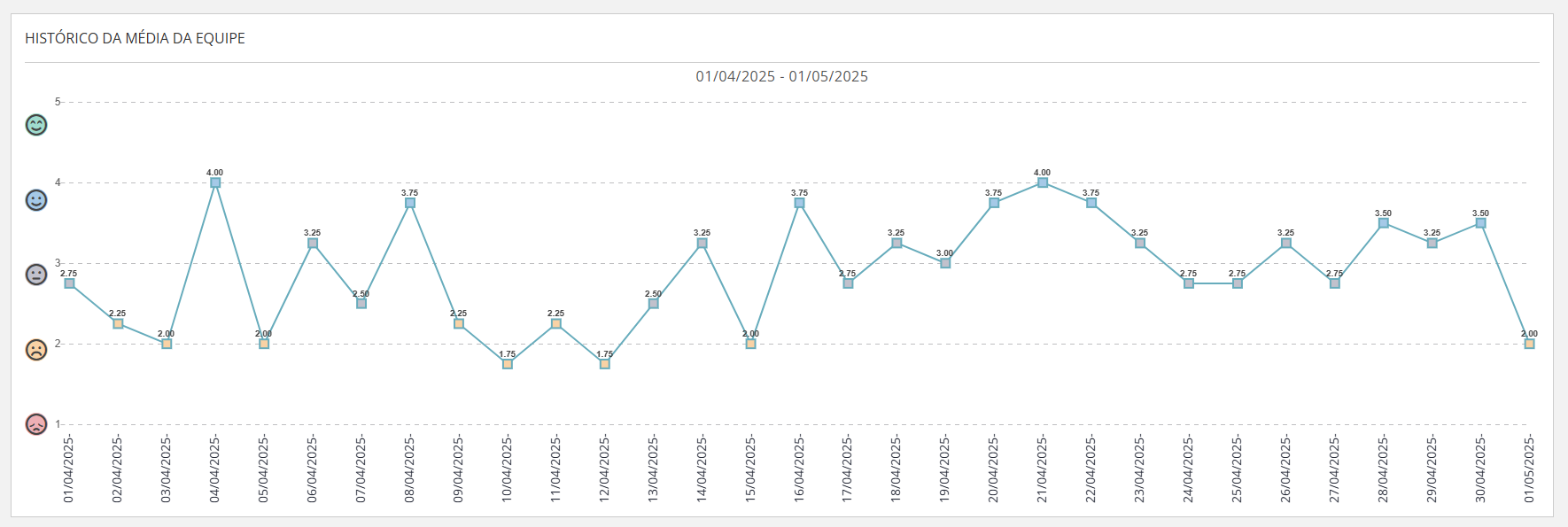 - Pontuação diária: Cada ponto da linha apresenta a média aritmética dos humores registrados no respectivo dia. Por exemplo, se em 04/04/2025 a média foi 4.00, significa que naquele dia a maioria dos colaboradores estava em um estado emocional positivo.