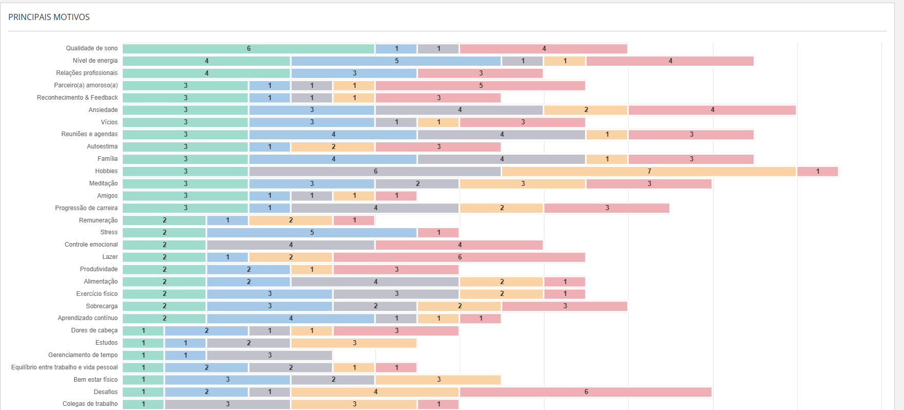- Quantidade por Sentimento: As barras são coloridas de acordo com os sentimentos vinculados aos motivos (por exemplo: Incrível, Bem, Normal, Mal, Horrível), e cada segmento indica quantas vezes aquele motivo foi associado a cada sentimento.