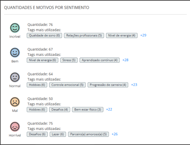- Motivo: Exibe a lista dos principais motivos (tags) selecionados nos registros de humor, como “Reuniões e agendas”, “Meditação”, “Família”, “Ansiedade”, entre outros.