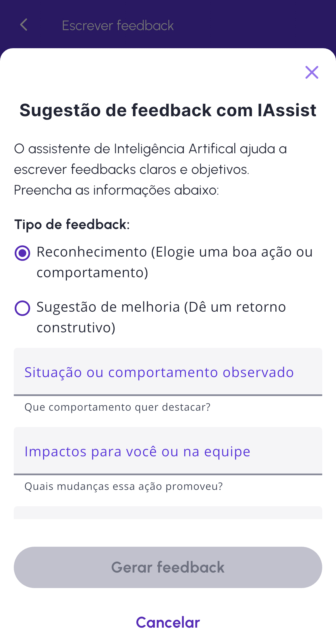 A opção de gerar um feedback via IAssist busca auxiliar colaboradores a criar uma sugestão para feedback via inteligência artificial. Por isso, é importante revisar o texto sugerido antes de enviar o feedback, a fim de que estejam condizentes com o tom e linguagem desejados, e daquilo que você pretende dizer.