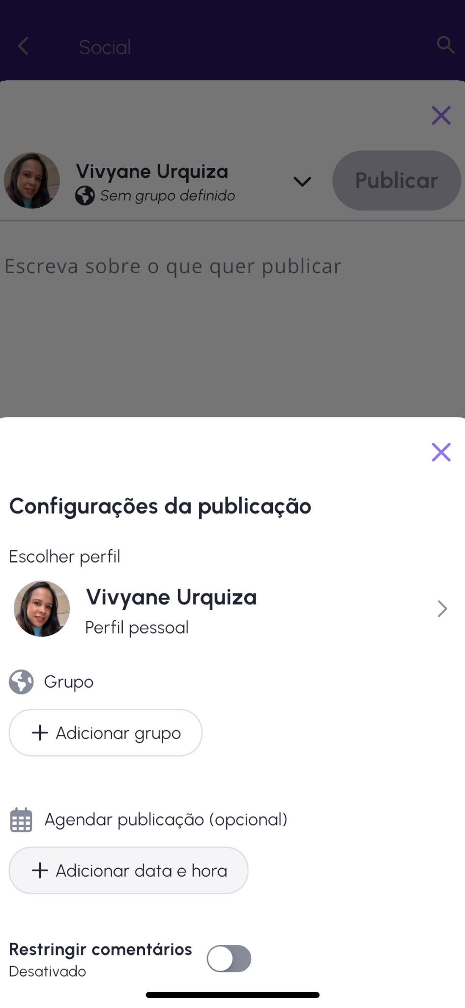 - Público/Grupo: escolha entre fazer a publicação na sua própria linha do tempo ou em um grupo do Social do qual você faz parte.