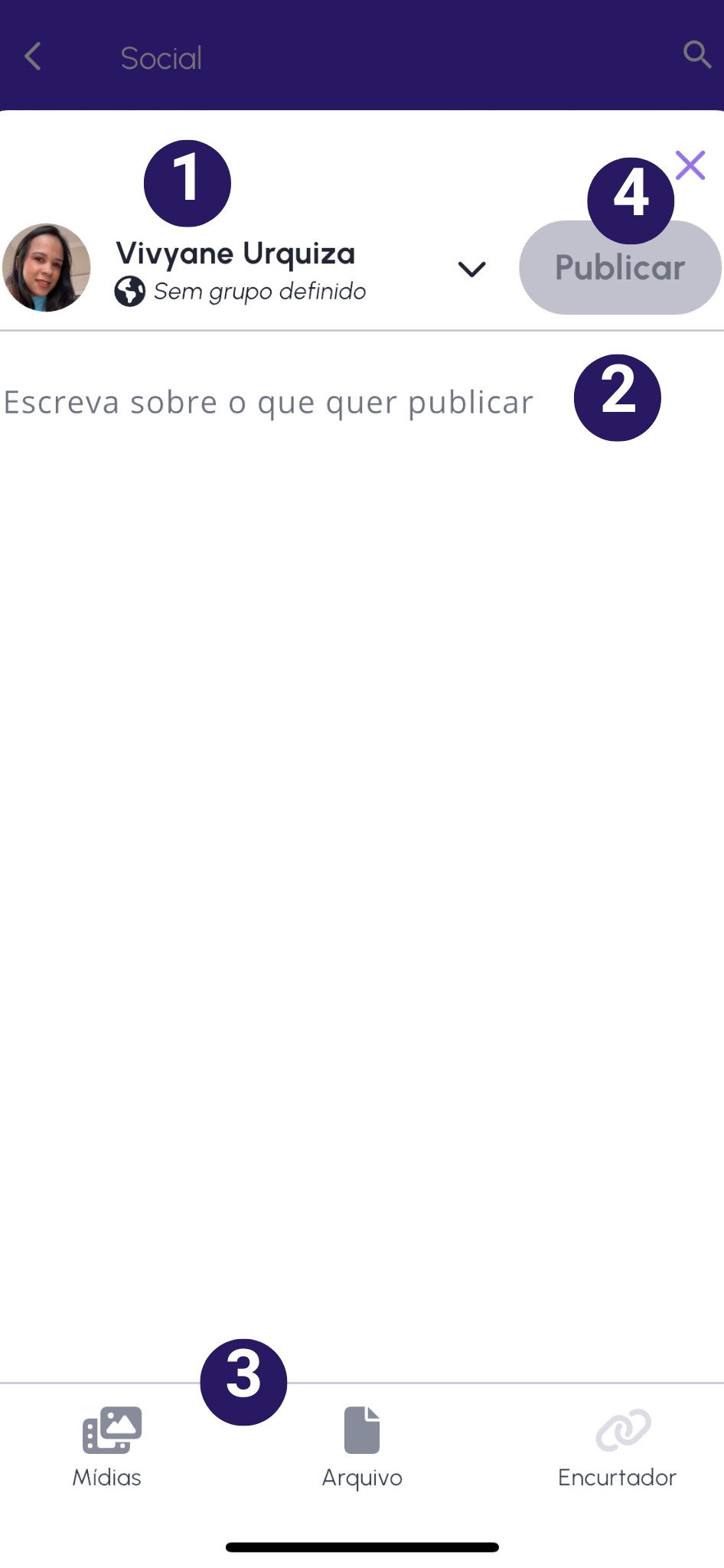 - Mídias: anexe fotos à sua publicação, podendo tirá-las na hora com a câmera ou escolher da galeria do seu celular.