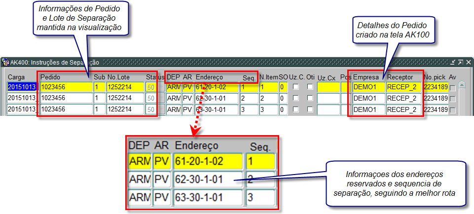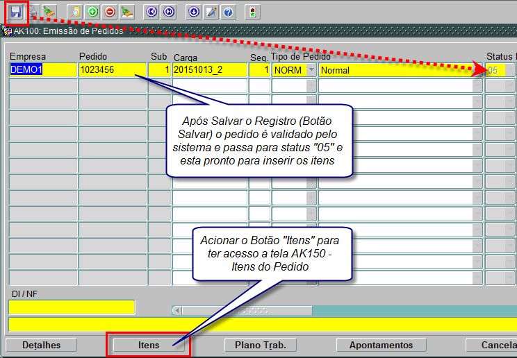A primeira coisa a fazer é entender os vínculos dos processos. Se verificar a AK400, nas informações referentes ao pedido, temos o número da carga e este é a informação que utilizaremos para dar sequência ao processo.