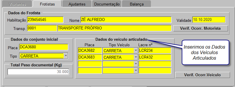 Após a inicialização da portaria, completar os dados e dar sequência aos processos, seguindo as regras estabelecidas. Se utilizar ajudantes; ou controla balança; ou se obrigatório documentos; se tem algum tipo de observação a ser anotada ou algum tipo de autorização para seguir adiante.