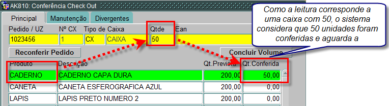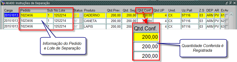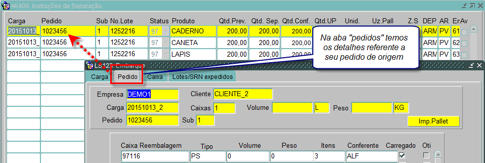 Após executar a pesquisa, podemos navegar pelas abas da tela (Carga / Pedido / Caixa / Lotes) e verificar os detalhes. Estes são os resultados de processos anteriores e se mantém ao nível de consulta.