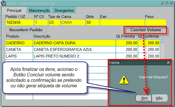 Seguimos as etapas de confirmação do processo onde são realizadas todas as validações sistêmicas. Teremos a informação de item não previsto (para a linha divergente) com a necessidade de validação.