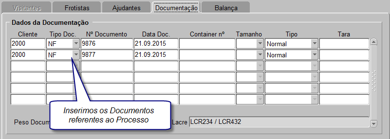 Estando no processo de controle de portaria, manter os documentos relacionados ao motivo de acesso (carga/descarga /ambos). Eles devem ser inseridos na portaria durante os complementos dos dados e se existir algum “Lacre” na carga, este também deverá ser marcado nesta aba.