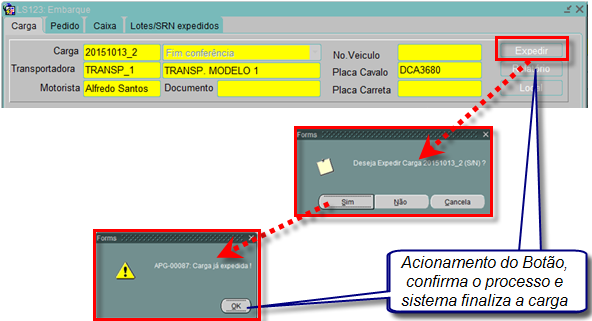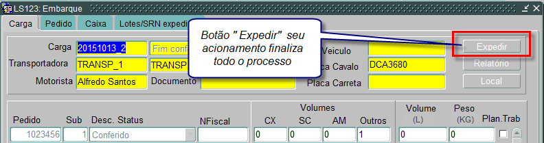 Em nosso modelo não estamos trabalhando com a expedição automática, sendo necessário o usuário com as devidas permissões executar o processo através da LS123, basta acionar o “Botão Expedir” para finalizar toda a operação.