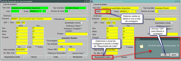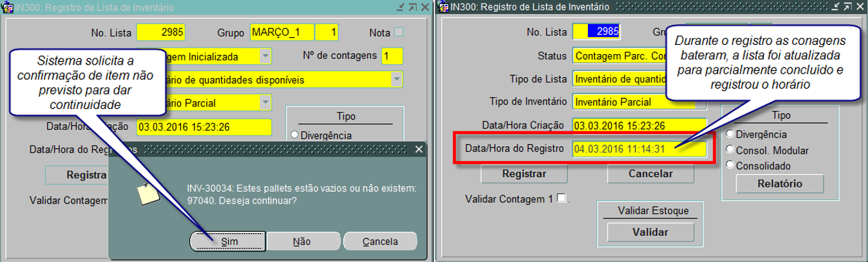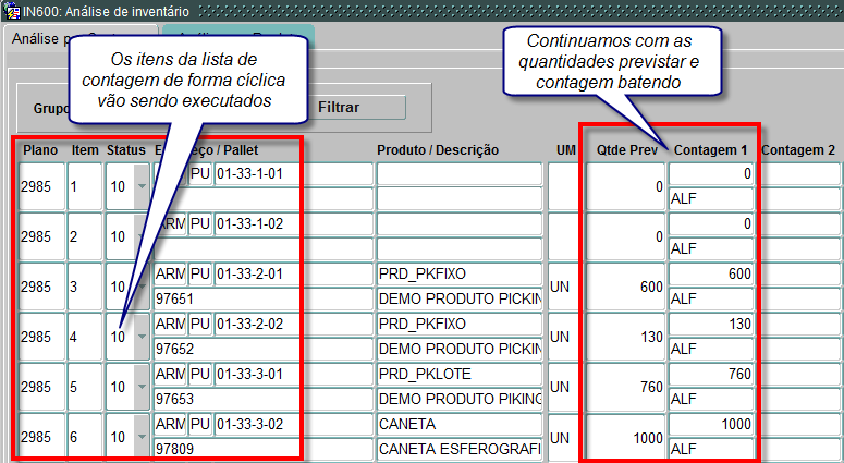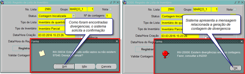 A partir do registro e das validações na tela IN300, o sistema verifica na lista todas as linhas previstas e seus saldos contados. Em caso de divergência é gerado uma lista de recontagem.