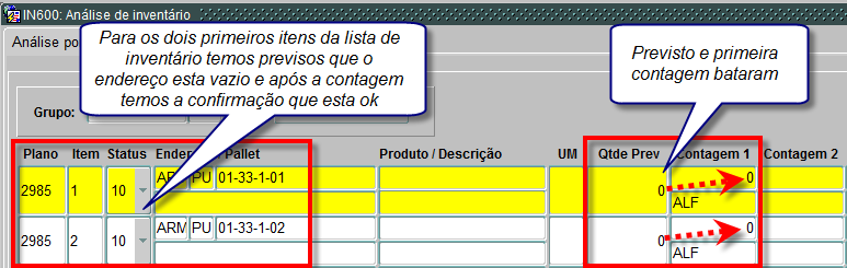 Se acompanharmos o plano na tela IN600 do WMS Alcis, veremos que realmente a previsão do endereço esta batendo com o físico: