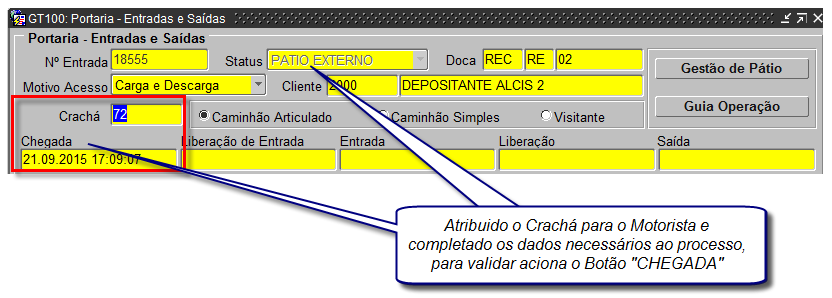 Para os agendamentos efetivados, eles devem ser integrados ao controle de portaria. Se o usuário optar pela opção de realizar o check-in, o sistema irá direcionar à tela GT100: Portarias - Entradas e Saídas, onde serão aproveitados todos os dados do agendamento. É necessário o completar as informações seguindo as rotinas de controle estabelecidas para o processo.