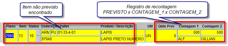 Temos o registro da lista onde foram confrontadas as quantidades previstas com as quantidades apurada durante a contagem, todos os itens que bateram (previsto x contagem 1) são finalizados e aguarda a conclusão da lista.