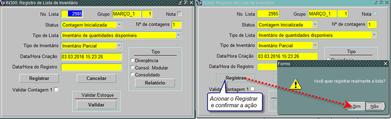 Para realizar o registro acessamos a tela IN300, pesquisamos a lista de inventário desejada e acionamos o botão de registro.