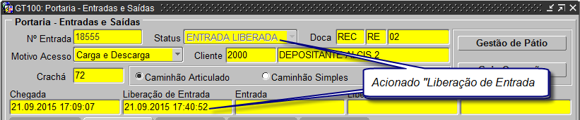 Com todos os dados seguindo as regras e o agendamento em tempo de execução, o usuário pode dar sequência ao processo acionando o botão “Liberação de Entrada”, e com isso avançamos o status do processo e já autorizarmos a entrada do veículo nas dependências da empresa.