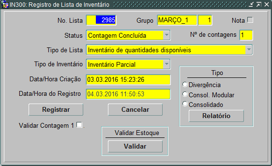 Com a mensagem final da lista de inventário, o operador de se dirigir até o administrador responsável pelo sistema e solicitar o registro da contagem (Tela IN300).