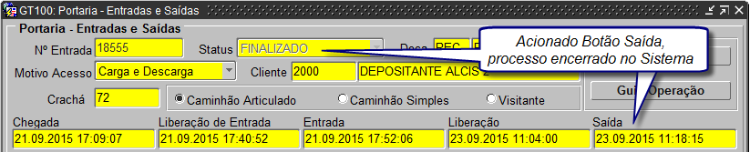 - Entrada: momento em que o veículo entra nas dependências da empresa. Dentro das dependências da empresa, o veículo pode passar pelo controle de pátio, onde são indicados os destinos de carga/descarga e inseridos nos controles do sistema.