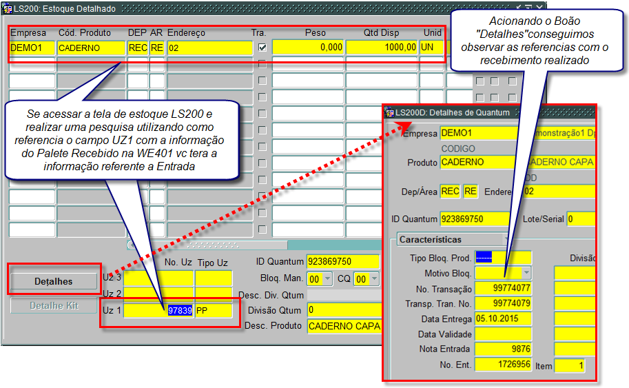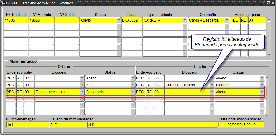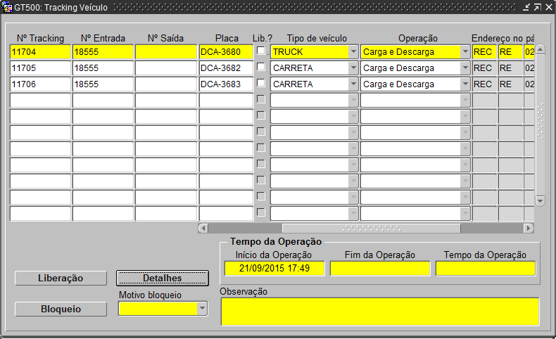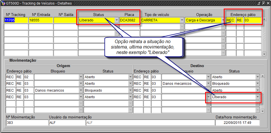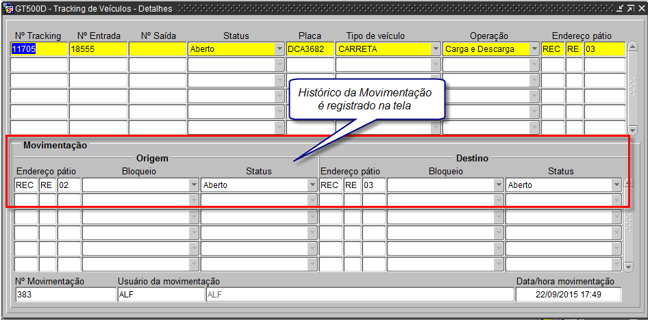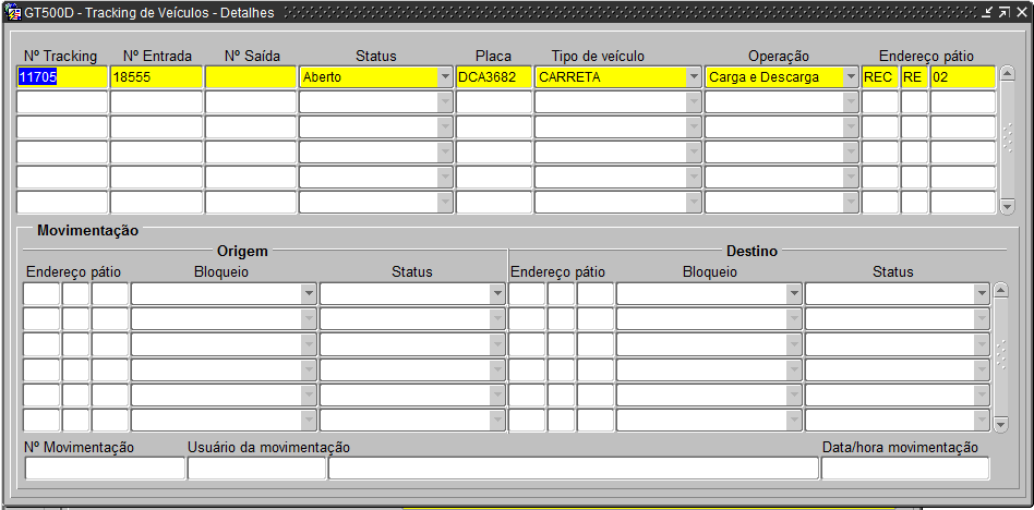 Se acionarmos a opção “GT500 – Botão DETALHES” terá acesso às informações detalhadas do processo de movimentação.